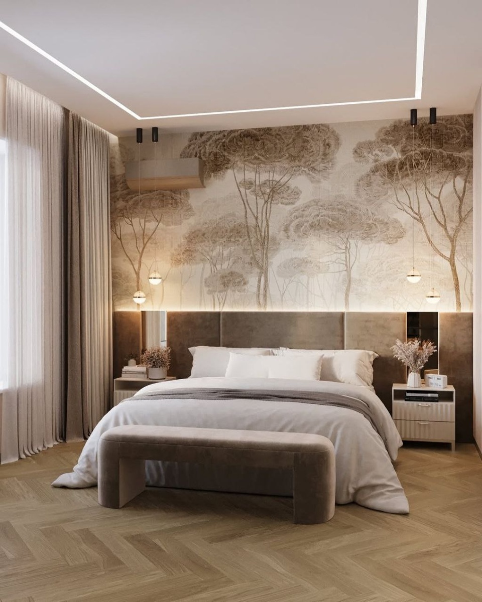 Спокойные оттенки спальни создают атмосферу уюта и расслабления. Мягкие текстуры, нюдовая палитра и природные мотивы на стене #InfinitoWalls@affrescoru (арт. Affresco 2370-COL2 ) визуально расширяют пространство и добавляют глубину." - Дизайн студия @auroom.group