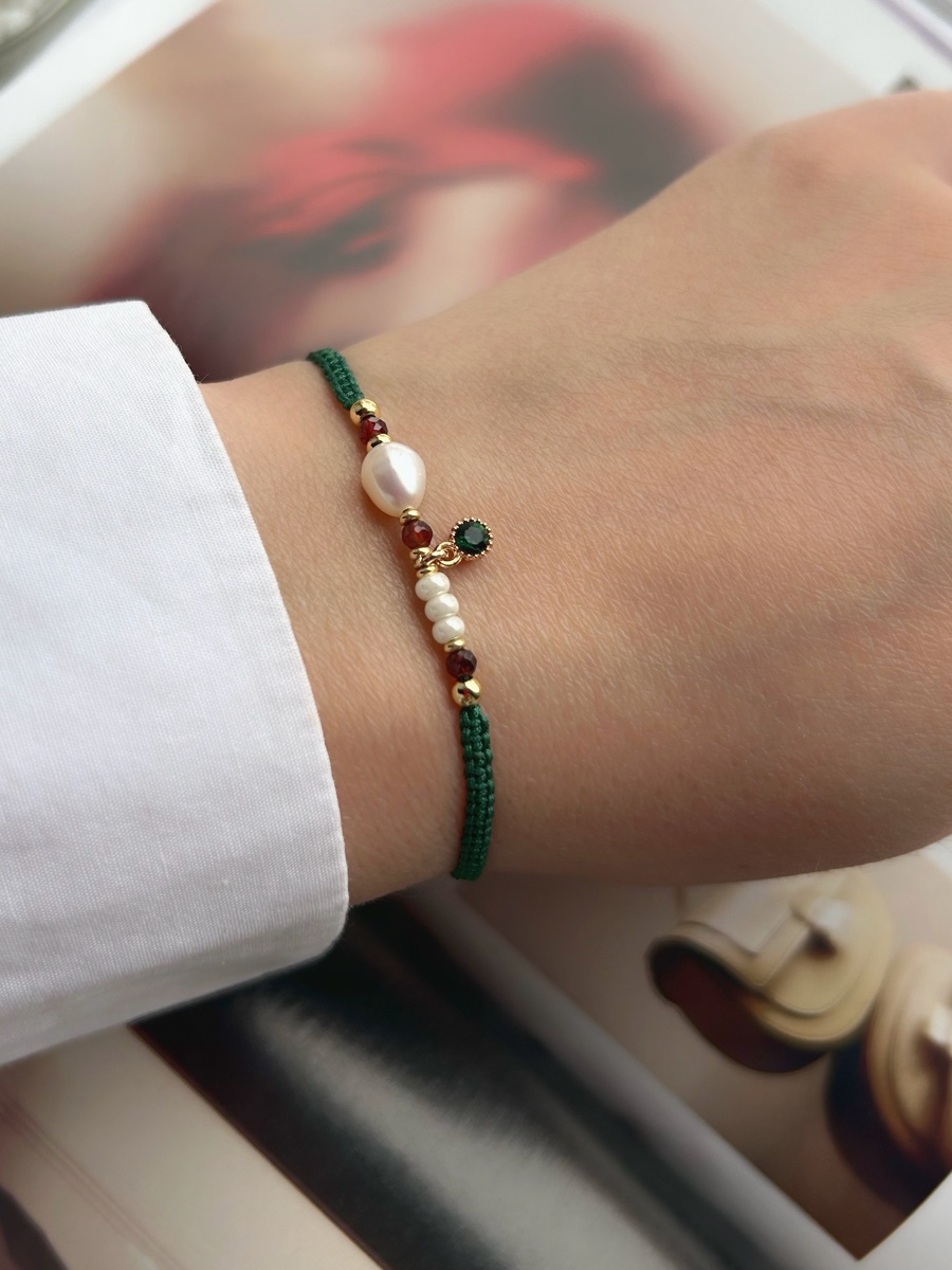 Я создавала этот браслет, думая о моментах, когда хочется чувствовать себя особенной. Жемчуг здесь — как символ чистоты, а зеленый изумрудный оттенок напоминает о лете и прогулках