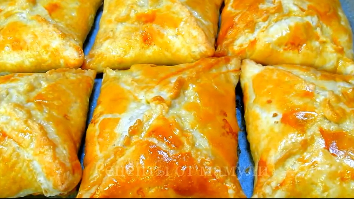 Люблю со слоёным тестом всё! Это всегда просто, быстро и вкусно тоже! Такие слойки готовлю с разной начинкой. Долго стоять у плиты вам не придется! Начинка прекрасно успевает пропечься вместе с тестом за 30 минут. Она получается очень сочной, не пересушенной. А сами слойки аппетитно хрустят. Готовим! Понадобится фарш. Беру куриные бёдра, отделяю кость, мякоть перемалываю на мясорубке. Фарш из куриных бёдер получается сочный. А чтобы он был вкуснее, добавляю соль, перец и любимые специи. Одну луковицу мелко нарезаю. Кладу лук в фарш. Очень люблю много зелени в таких слойках. Беру петрушку и укроп. Нарезаю зелень и добавляю в фарш. Перемешиваю и начинка готова. И поскольку нам хочется сделать всё быстро, беру слоёное пресное тесто. Взяла 2 упаковки по 500 г, в каждой по 4 листа. Делю лист на две части. Каждую часть раскатываю в квадрат размером 15*15. Кладу 1 ст.л с горкой фарша. Соединяю стороны и делаю защипы. Получается конвертик. При желании в фарш можно добавить творожный с