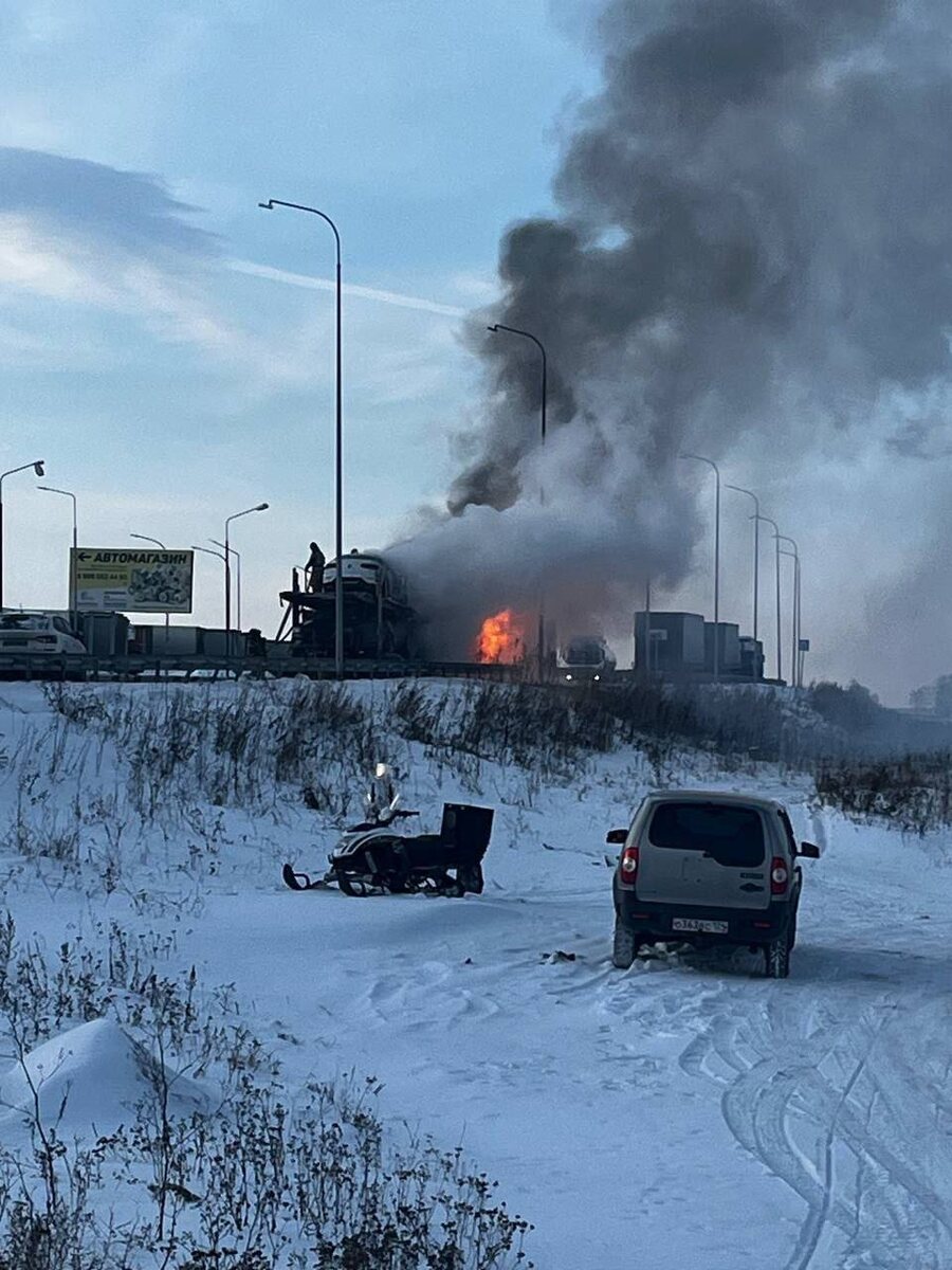 Под Красноярском загорелся автовоз с легковыми автомобилями