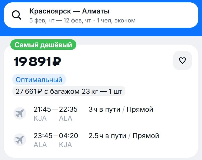 В Алматы в феврале, кстати, тоже хорошо. У нацперевозчика такой вариант на недельку: