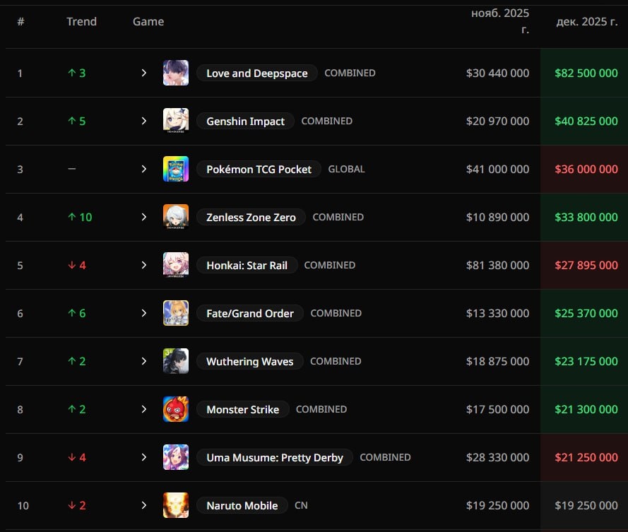 У HoYo выдался хороший месяц, но Лавдип пока вновь обгоняет 1⃣ Геншин поднялся на 5 строчек вверх на 2 место в общем топе и заработал 40.8 млн $. Все мы ждали Дурина и дождались 2⃣ HSR, наоборот, упал на 4 строчки с доходом в 27.8 млн $. Уверена, он реабилитируется с выходом следующей арки патчей 3⃣ Зона сделала невероятное, впервые, наверное, с патча 2.0, вернулась в десятку и взлетела на 4 место в топе, заработав 33.8 млн $ 💬 Как думаете, какие результаты будут в январе? ㊗️ Поддержи Сенсея бустом / Подпишись на Сенсея
