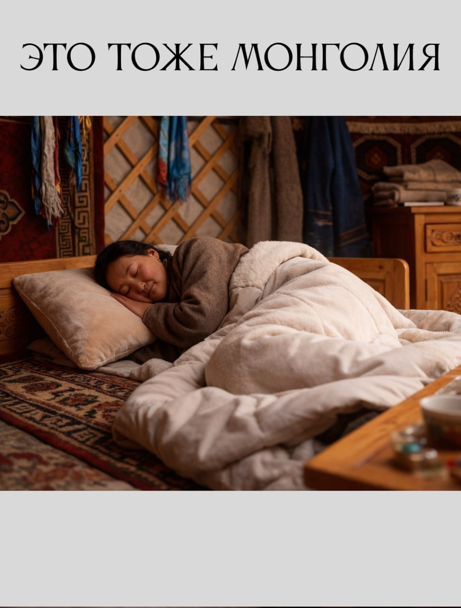 ». Это время восстановления. 😴 В юрте тепло распределяется мягко и равномерно. Здесь спят глубоко и спокойно — без спешки, потому что впереди день, требующий сил и внимания. 🛏 Сон всегда был частью заботы о теле. Такой же важной, как еда и тепло. Ритм жизни в Монголии веками подстраивался под природу. Солнце задаёт темп дня, тишина степей помогает телу расслабиться, а ночь — по-настоящему отдохнуть. Поэтому сон здесь естественный: когда темнеет — засыпают, когда светает — просыпаются. В традиционной кочевой культуре был и короткий дневной отдых — после обеда, чтобы восстановиться после физического труда и жары. А ночью спали крепко: в юртах, часто на полу, укрывшись тёплыми одеялами, где особенно ценятся тишина и комфорт. Даже сегодня, в городах, многое изменилось — но уважение ко сну осталось. Он по-прежнему воспринимается как необходимость, а не роскошь. Наверное, поэтому к вещам для сна в Монголии всегда относились особенно внимательно. К тому, что согревает, не мешает телу