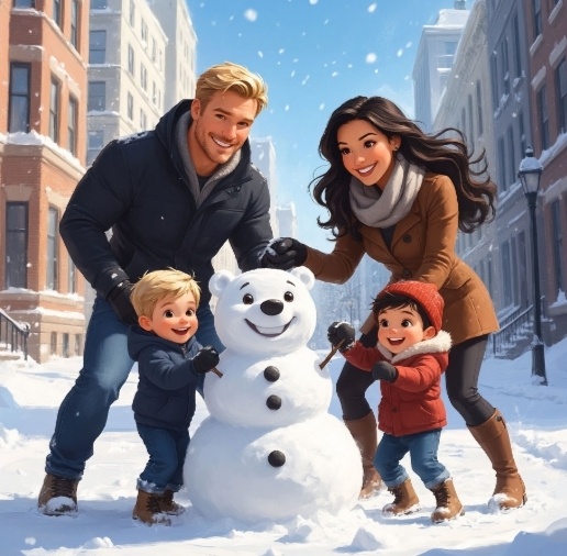 Снеговики нарядные ,дети довольные. Мама говорит: «Это шедевр!», а папа добавляет: «Согласен! ».