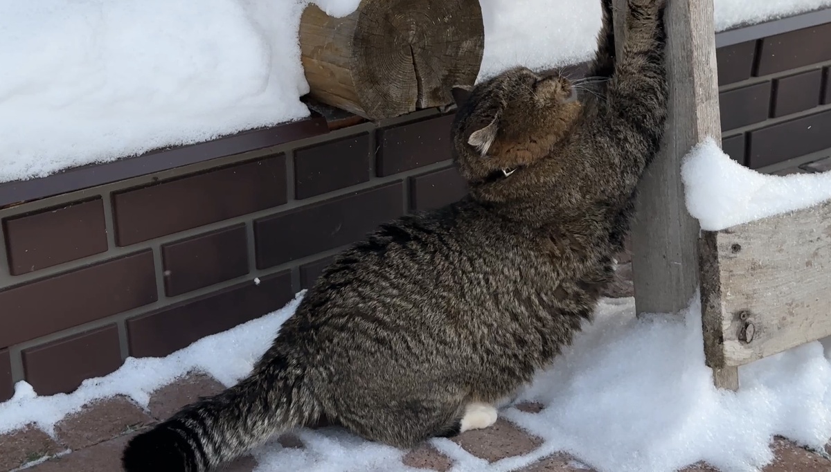 Весь в снегу, как зимний кот,