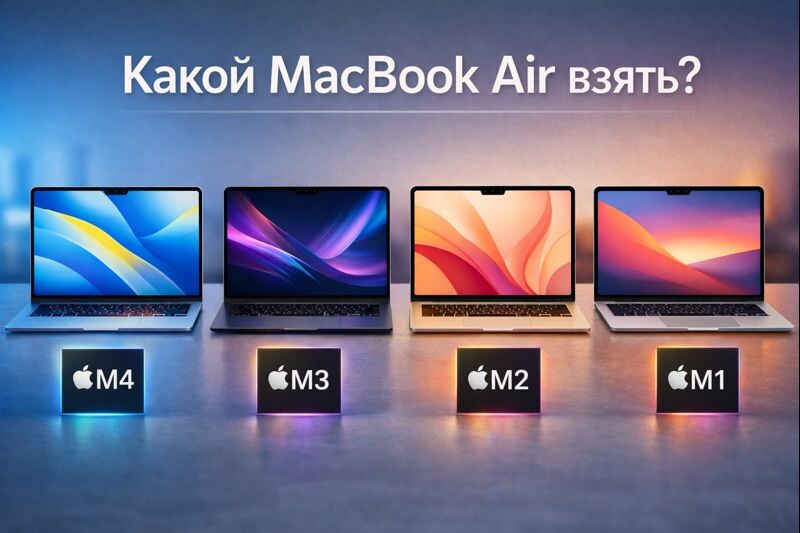 Линейка MacBook Air сегодня — это, пожалуй, самая сложная задача выбора среди всех ноутбуков Apple. В продаже и на вторичном рынке одновременно присутствуют версии на M1, M2, M3 и M4, цены заметно отличаются, а реальные сценарии использования — далеко не всегда упираются в «чистую» производительность.