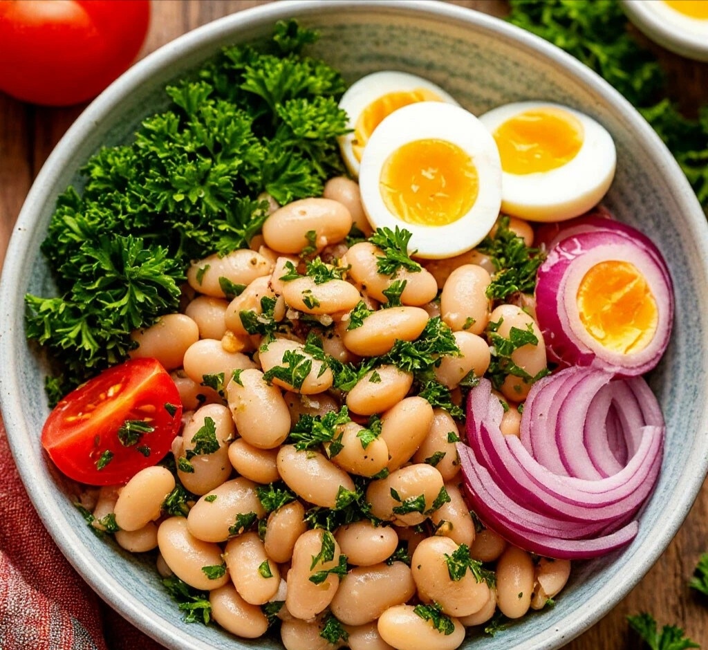 🍅 ИНГРЕДИЕНТЫ: ·Фасоль белая консервированная — 2 банки (800 г) ·Лук красный — 1 крупная головка ·Петрушка плосколистная — большой пучок (50-70 г) ·Яйца куриные — 3 шт. Для заправки: ·Оливковое масло extra virgin — 5 ст.л. ·Сок 1 крупного лимона ·Соль, свежемолотый чёрный перец — по вкусу.