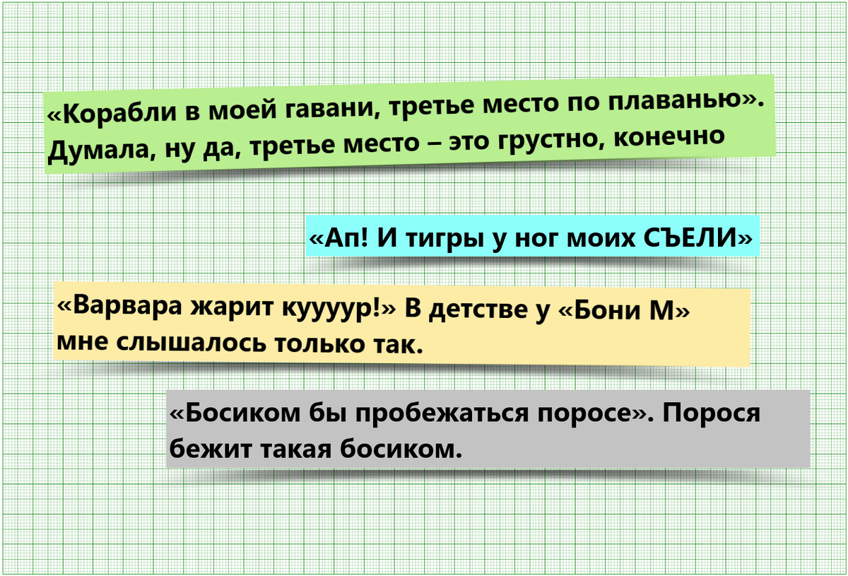 Когда человек слышит песню, ему слышится то, что не поётся в песне. Это называется «мондегрин». В общем, не будем медлить и сразу начинаем. Некоторые пользователи интернета рассказывают, что вместо «Ап! И тигры у ног моих сели» они слышат «Ап! И тигры у ног Моисея» или же «Ап! И тигры у ног моих съели». Песня черепахи Тортиллы начинается со слов: Затянулась бурой тиной Гладь старинного пруда Но многие слышат так: Затянулась Буратиной Гладь старинного пруда Буратиной? Песня хоть из «Приключений Буратино», но я всегда слышал оригинальный вариант песни про бурую тину, а не Буратино. В одной народной песне поётся: Шумел камыш, деревья гнулись Но кто-то слышат там это: Шумелка-мышь, деревья гнулись Интересно, что это за шумелка, которая ещё и мышь? Интересно, кто не слышал песню «Арлекино»? Думаю, все. Что вы там слышите? Большинство людей слышат это: Арлекино, Арлекино Есть одна награда - смех! Но есть люди, которые слышат это: Арлекино, Арлекино Есть одна нога на всех! И после этих строче