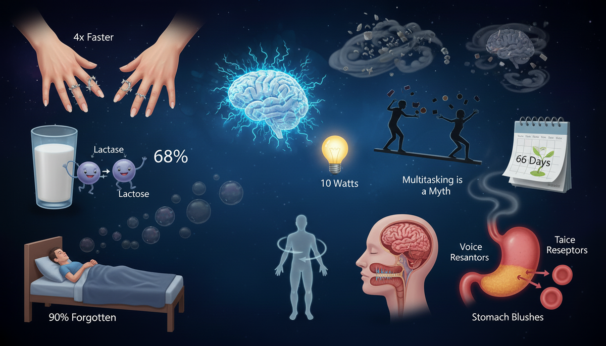 Ваше тело — это не просто плоть и кости. Это невероятно сложный, постоянно обновляющийся и порой загадочный механизм, полный удивительных фактов, о которых вы, скорее всего, даже не догадывались. От того, почему пальцы двигаются без собственных мышц, до того, как обоняние помогает отличить яблоко от репы — каждая деталь раскрывает удивительную историю эволюции, адаптации и биологического чуда. Давайте заглянем внутрь и откроем для себя необычные истины, скрытые в нас самих. В пальцах нет мышц, отвечающих за их движение — эти мышцы находятся в ладони и предплечье. Само слово «мышца» происходит от латинского musculus, что буквально означает «маленькая мышь»: римляне видели в сокращающемся бицепсе что-то похожее на бегущую мышку под кожей. За всю жизнь человек в среднем проходит около 177 000 километров — это в четыре раза больше длины экватора Земли или почти в два раза больше расстояния от Земли до Луны. Так что не забывайте выбирать удобную обувь! Если вы отправитесь в космос, ваш мозг