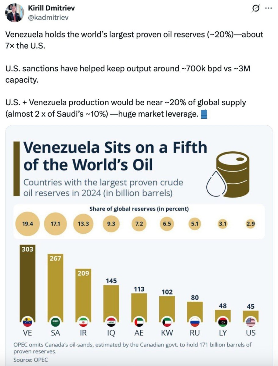 Спецпредставитель президента РФ по инвестиционно-экономическому сотрудничеству с зарубежными странами, глава РФПИ Кирилл Дмитриев подчеркнул лидерство Венесуэлы в объеме нефтяных запасов. "В Венесуэле находятся крупнейшие в мире доказанные запасы нефти (около 20% мировых) - примерно в 7 раз больше, чем у США", - написал он. Дмитриев отметил, что американские санкции удерживают добычу на уровне около 700 тыс. баррелей в сутки при потенциале около 3 млн. По его словам, если сложить добычу США и Венесуэлы, то она составит пятую часть мирового предложения, что практически в два раза больше, чем в Саудовской Аравии. Далее он привел в пример шкалу ресурса Statista, по данным которой Венесуэла, предположительно, имеет запасы в количестве 303 млрд баррелей нефти и занимает первое место Lesen Sie weiter unten auf Deutsch...
