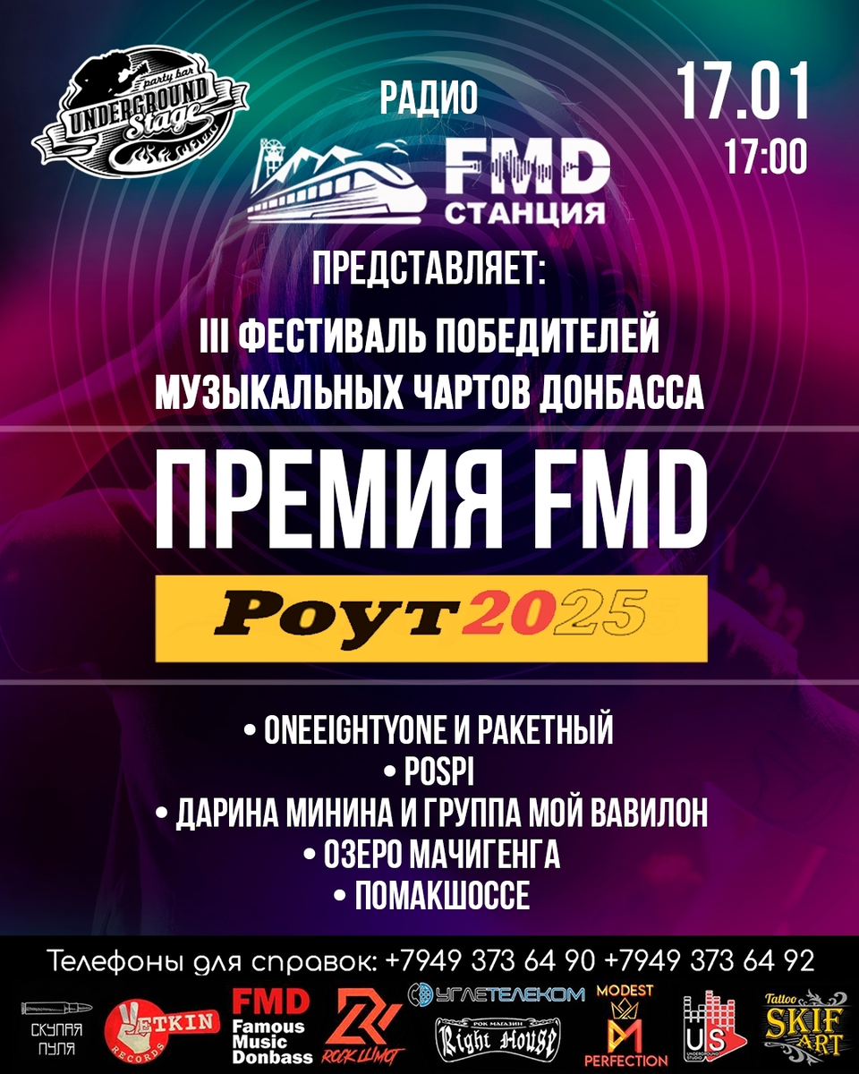 Главные герои года: • ONEEIGHTYONE И РАКЕТНЫЙ. Лучший хип-хоп Главного Чарта Донбасса. Долгожданный дебют в Донецке. • POSPI. Главное открытие года. Лучший пост-панк. • ДАРИНА МИНИНА И «МОЙ ВАВИЛОН». Рок-дива года. Победитель ПРЕМИИ FMD 2024. • ОЗЕРО МАЧИГЕНГА. Лучшая гранж-группа 2025 года. • ПОМАКШОССЕ. Легендарный непредсказуемый перформанс. Никто не знает, что они выдадут!