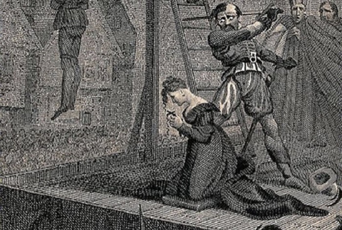 Проходя мимо солдат, она поднялась на эшафот и обратилась к немногочисленным собравшимся: “Добрый люд, я пришла сюда, чтобы умереть. Заговор против королевы был незаконным, но я не была его зачинщиком. Я не хотела этого. Перед Богом я чиста. Прошу вас в последние минуты моей жизни поддержите меня своими молитвами”.