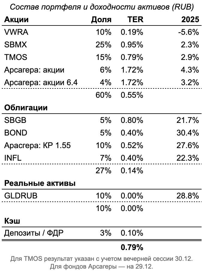 Под конец года впервые случилась ребалансировка с продажей активов. В декабре продавал пару процентов сильно выросшего золота и на вырученные деньги покупал фонды акций. Ещё воспользовался безналоговым обменом паев внутри УК (Арсагера), чтобы срезать отросший фонд облигаций и перекинуть эту часть в акции. Остается продать и перераспределить лишние 1,5% INFL, но по нему ещё нет ЛДВ — жду весны.