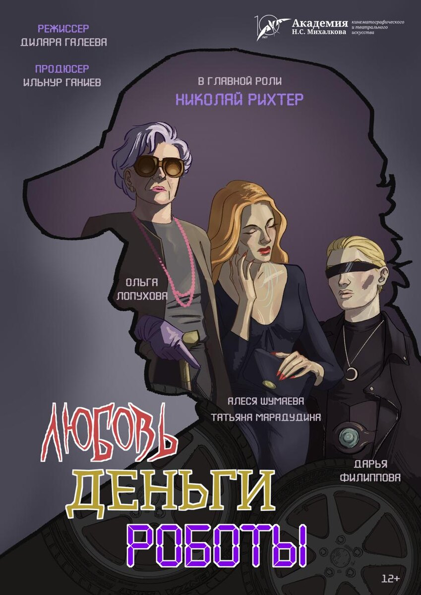 Ещё одна учебная (курсовая) работа – «Любовь, деньги, роботы» 🚗 Режиссёр – Дилара Галеева (мастерская Владимира Михайловича Аленикова) Продюсер – Ильнур Ганиев В ночной автосервис приезжает женщина и просит поменять разбитую фару. Автомеханик начинает рутинный ремонт, но внезапно события принимают совсем другой оборот… Фильм-альманах, в котором одна история развивается сразу в трёх разных жанрах: детектив, ужасы и фантастика.