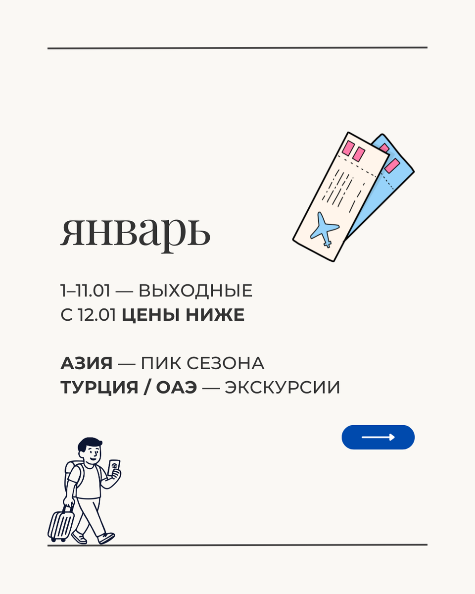 Когда и куда выгодно лететь. Планируете отпуск? Сохраняйте, чтобы не переплачивать за туры 🔥 ЯНВАРЬ 1–11.01 — выходные. с 12.01 цены снижаются. ✈️Азия в пике: Таиланд, Вьетнам, Мальдивы, Шри-Ланка, Куба, Сейшелы. Турция / ОАЭ / Египет — море прохладное, зато идеально для экскурсий и шопинга. ФЕВРАЛЬ ‼️ Лайфхак: 23.02 + возьмите отпуск 24–27 = почти неделя отдыха. ✈️Азия, Куба, Африка (Занзибар, Кейптаун, Марокко). ❗️ Высокий спрос: школьные каникулы + Китайский Новый год. МАРТ – АПРЕЛЬ ‼️ Лайфхак: 8 марта переносится на 9 +возьмите отпуск 10–13.03 = неделя отдыха. ✈️Апрель: Теплый Ближний Восток: ОАЭ, Оман, Катар, Япония (цветение сакуры). ❗️ Конец марта – начало апреля школьные каникулы: рост цен. МАЙ 1–9.05 — самый дорогой период ‼️ Лайфхак: Возьмите отпуск 4–8.05 = 11 дней отдыха. ✈️ Египет, Турция, Таиланд, Вьетнам, Шри-Ланка, Мальдивы. ❗️ С 12.05 — цены ниже, туристов меньше. ИЮНЬ ‼️ Лайфхак: Возьмите отпуск 8–11.06 = 9 дней отдыха. ✈️Турция, Европа, Египет, Азия. Начало мес