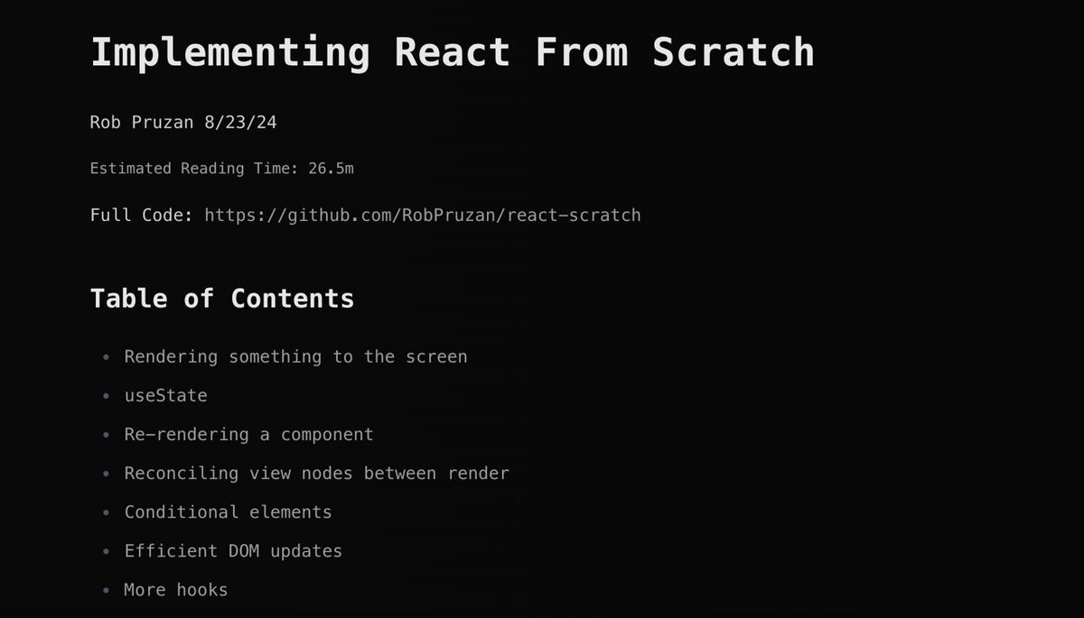 Этот гайд показывает, как написать упрощённый React своими руками. Использовать такой код в продакшне не будешь, зато становится понятно, как внутри работают рендеринг, состояние и обновления. В статье есть и разбор, и ссылка на GitHub с готовым примером — можно покопаться и поэкспериментировать. Подробнее: https://www.rob.directory/blog/react-from-scratch
