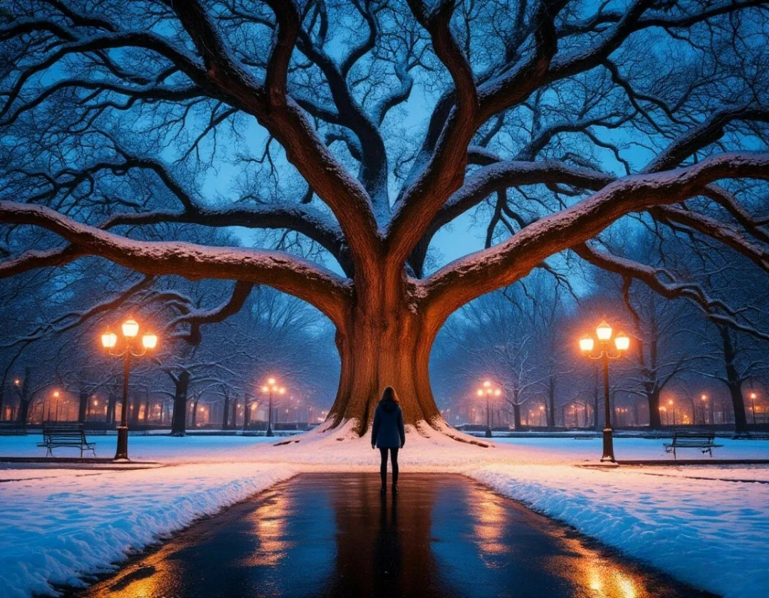 В двадцать три пятьдесят восемь она встала ровно в центре переплетения корней дуба. В руке она сжимала телефон и монету. Мир замер. Снег, казалось, перестал падать.