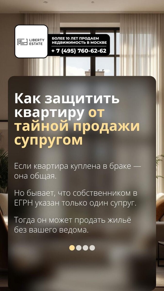 Если квартира куплена в браке, то она общая. И вот представьте: Вы готовитесь к разводу, а квартира уже продана. Такое может случиться, если в выписке из ЕГРН собственником указан только один супруг. Он может продать жилье без вашего ведома. Да, Росреестр может зарегистрировать сделку без согласия супруга. Как себя защитить: - Внесите сведения о совместной собственности в ЕГРН. - Тогда без вашего нотариального согласия продать квартиру не смогут. Достаточно просто подать заявление в МФЦ (госпошлина при этом не взимается). Важный нюанс - сделать это можно пока вы ещё находитесь в браке. Иногда лучше перестраховаться, тем более, что эта процедура простая и бесплатная. Узнать подробнее👇🏻 Телефон: +74957606262 What'sApp: Написать 👈
