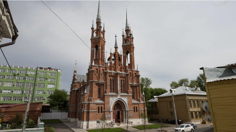 Церковь Святого сердца Иисуса уже более ста лет является визитной карточкой Самары. Это красивейший и второй по величине католический храм Росссии, известный в народе как "польский костел". В начале 1980-х годов католическая община Самары, состоящая в основном из поляков ( в Самаре их проживало около 2 тыс. ), купила землю и построила на ней деревянную церковь. Дальнейшее расширение общины, позволило в 1902 году начать строительство каменного храма по проекту московского архитектора Фомы Богдановича. Строительство, которое обошлось общине в 80 тыс. рублей, вели нижегородские каменщики под руководством самарского архитектора Александра Щербачева. Кроме того, для храма из Австрии выписали великолепный орган, стоящий 5 тыс. рублей. 12 февраля 1906 года храм был торжественно освящен. Храм действовал до 20-х годов, а в 30-е был закрыт и разграблен. От разрушения храм спасло размещение в нем в 1941 году краеведческого музея, который более 50 лет рассказывал посетителям о истории самарского к