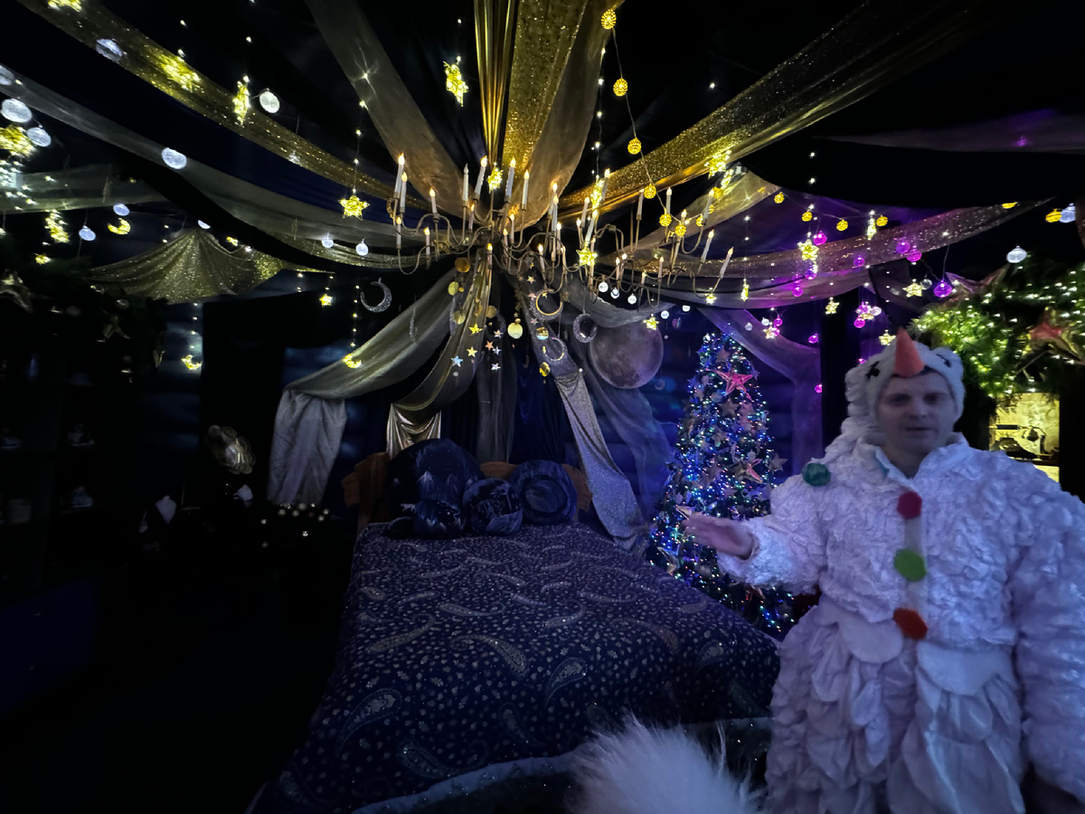 Начинаем наш поход в терем к Деду Морозу, а экскурсию проводит верный помощник — Снеговичок. Первая комната — спальня Деда Мороза, где ему снятся волшебные сны.