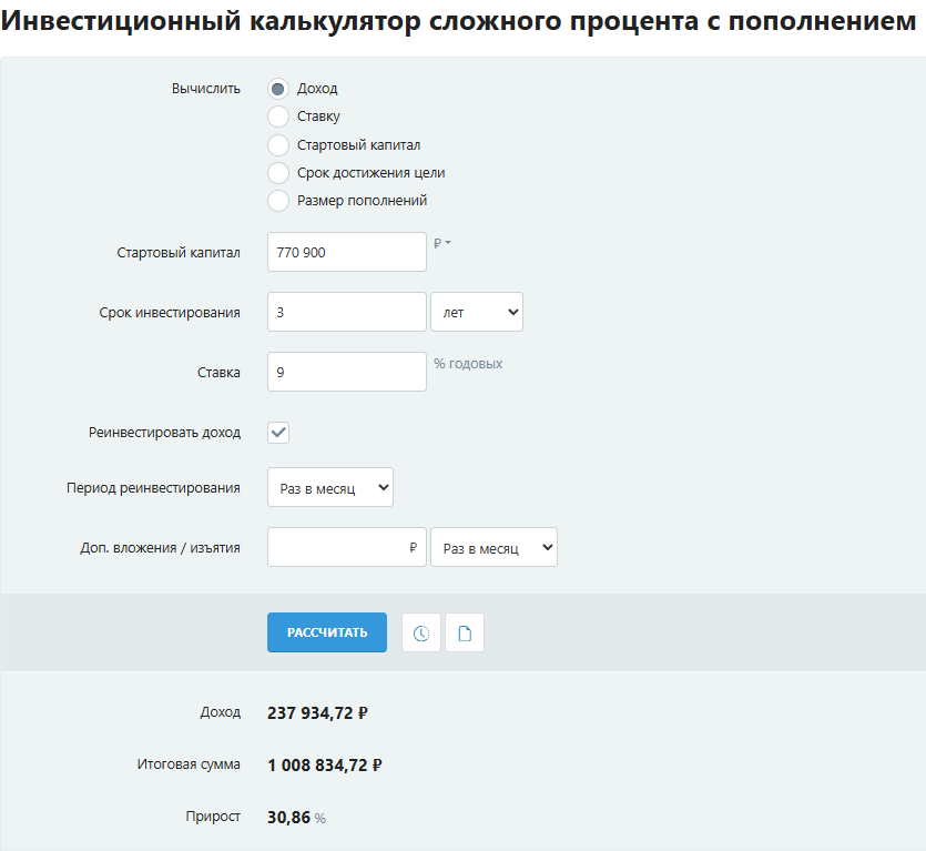 1. Для начала, определите сумму, которая нам нужна для покупки. Для этого посмотрите средние рыночные цены того авто, которое вас интересует. Но это не конечная сумма нашего накопления. Деньги с каждым годом дешевеют, и, чтобы определить конечную сумму, нужно учесть инфляцию в наших расчётах. Средняя инфляция в России находится на уровне 8,3% за последние 20 лет. Для расчетов мы возьмем 9%. Рассчитать итоговую сумму с учетом инфляции можно с помощью инвестиционного калькулятора. — Стартовый капитал — тут указываете текущую стоимость вашей покупки.