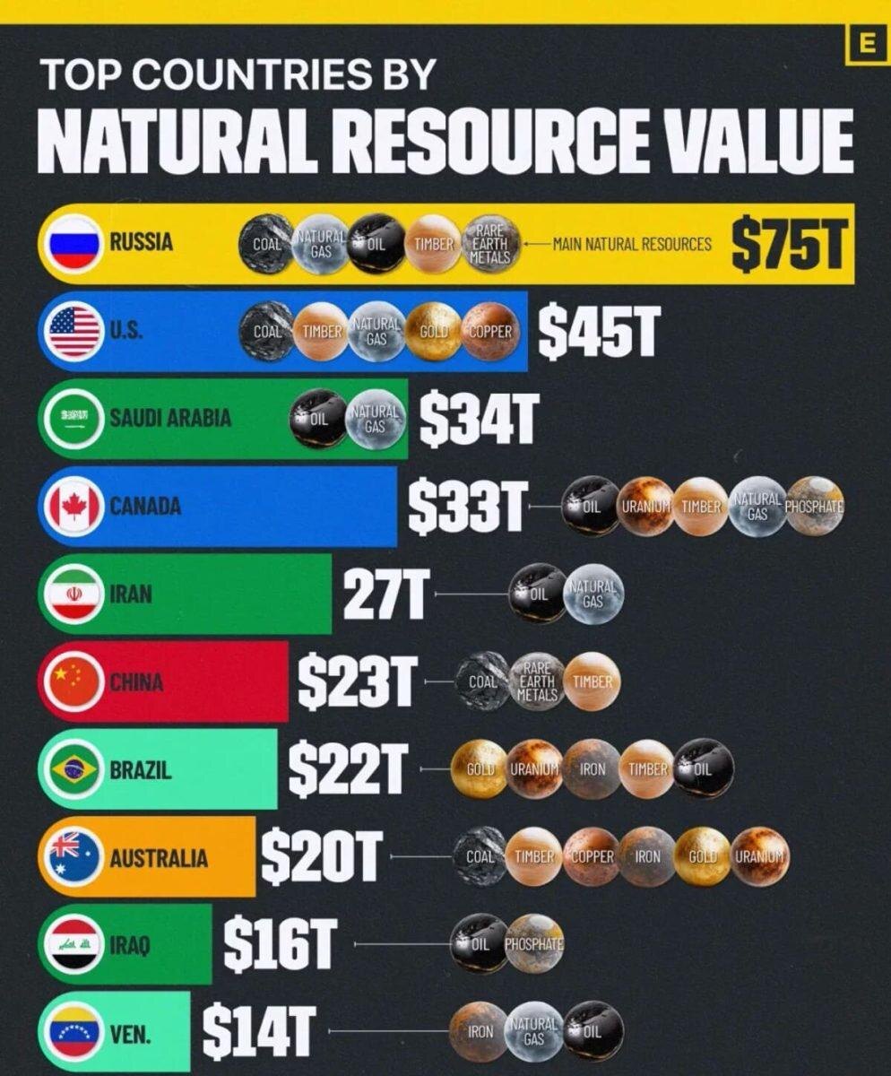Сегодня в рубрике «Картинка выходного дня» поговорим про ресурсы. 1️⃣ Фразу «География — это судьба» приписывают Наполеону Бонапарту. Добавлю от себя, что природные недра страны тоже влияют (а, возможно, и определяют) судьбу страны. 2️⃣ Российская Федерация занимает лидирующие позиции, обладая природными ресурсами, оцениваемыми как минимум в 75 триллионов долларов. 3️⃣ Можно долго сокрушаться над «ресурсным проклятием», а можно посмотреть на это под иным углом, рассматривая природные ресурсы как крутое конкурентное (и довольно долговременное) преимущество. 🤔 4️⃣ Цель, по моему скромному мнению, не в том, чтобы отказаться от «базы», которой нас одарила география и наши предки, игнорируя это великое преимущество, а в том, чтобы создать на её основе крепкую, эффективную и взаимодополняющую экономическую надстройку. ______________________________________ Если заметка была для вас интересной, то поддержите её 👍 или поделитесь ей с коллегами. 🙂 Подписывайтесь на канал в Дзен, чтобы не про