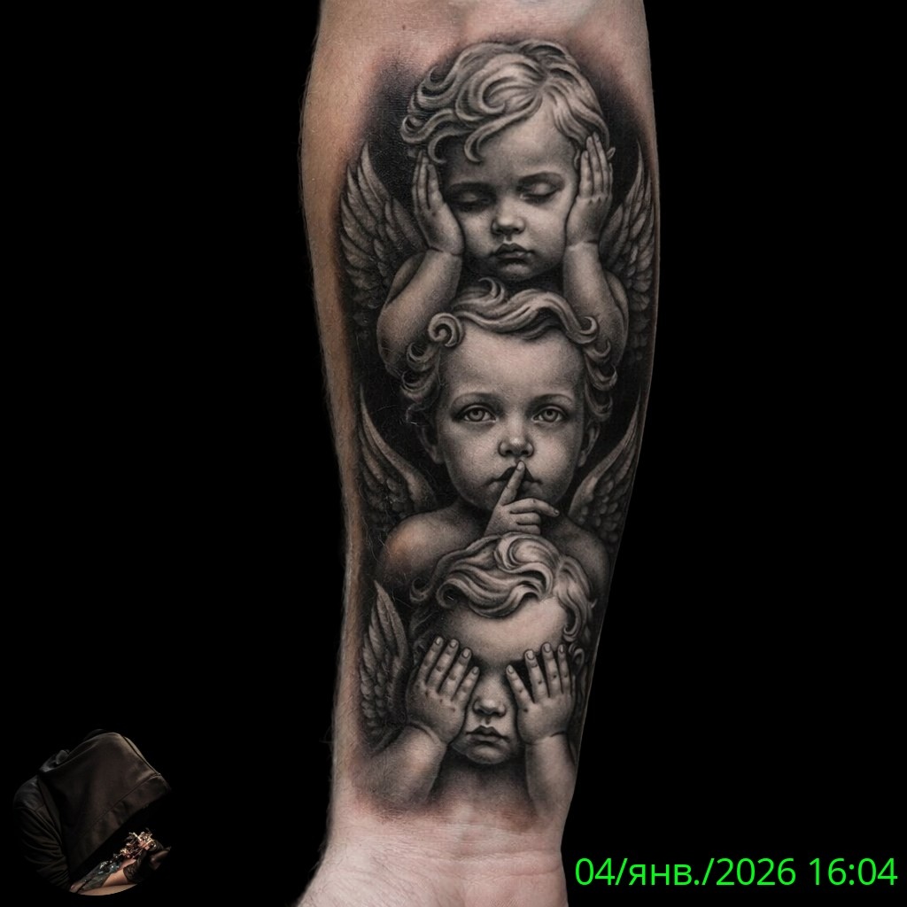Татуировка, изображённая на фото, представляет собой трёх ангелов, каждый из которых символизирует один из принципов восточной философии: «не вижу зла», «не слышу зла» и «не говорю зла». Эти образы часто ассоциируются с мудростью и стремлением к внутреннему покою.