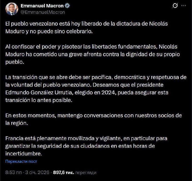 Макрон заявил, что Венесуэлу на переходный период должен возглавить оппозиционный политик Эдмундо Гонсалес Уррутия. Об этом он написал в X. Президент Франции напомнил, что по подсчетам оппозиционных сил именно Гонсалес победил на президентских выборах в 2024 году. "Переходный период, который начинается, должен быть мирным, демократичным и уважительным к воле венесуэльского народа. Мы надеемся, что президент Эдмундо Гонсалес Уррутия, избранный в 2024 году, сможет обеспечить этот переход как можно быстрее. В настоящее время я веду переговоры с нашими партнерами в регионе", - написал Макрон. 🤗 НАСОНОВ 🔴