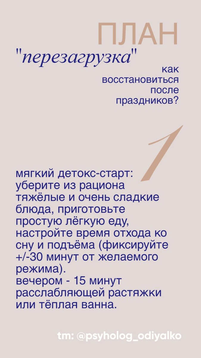 праздников. 🌸Дыхательное упражнение 4-4-6: вдох 4 секунды, задержка 4 секунды, выдох 6 секунд — 5 циклов для снижения тревоги. Практика «короткой остановки» на 1–2 минуты: закрыть глаза, сосредоточиться на ощущениях тела, отметить три явных ощущения. Малые радости: чашка любимого чая без гаджетов, 10 минут любимой музыки, прогулка без цели — эти простые вещи восстанавливают ресурс. 🌸Работа с энергией и границами Не пытайтесь вернуть весь праздничный темп сразу: выберите 2–3 активности, которые действительно важны, и откажитесь от остального на ближайшие 1–2 недели. Учитесь говорить «нет» мягко, но твёрдо; формулируйте коротко причину и альтернативу («Сейчас не могу, могу на следующей неделе/через день»). 🌸Если чувствуете, что усталость не уходит Если постоянная сонливость, раздражительность, проблемы со сном или мотивацией сохраняются более двух недель - имеет смысл обратиться к специалисту (психологу или врачу) для исключения депрессии, нарушений сна или соматических причин. Экс