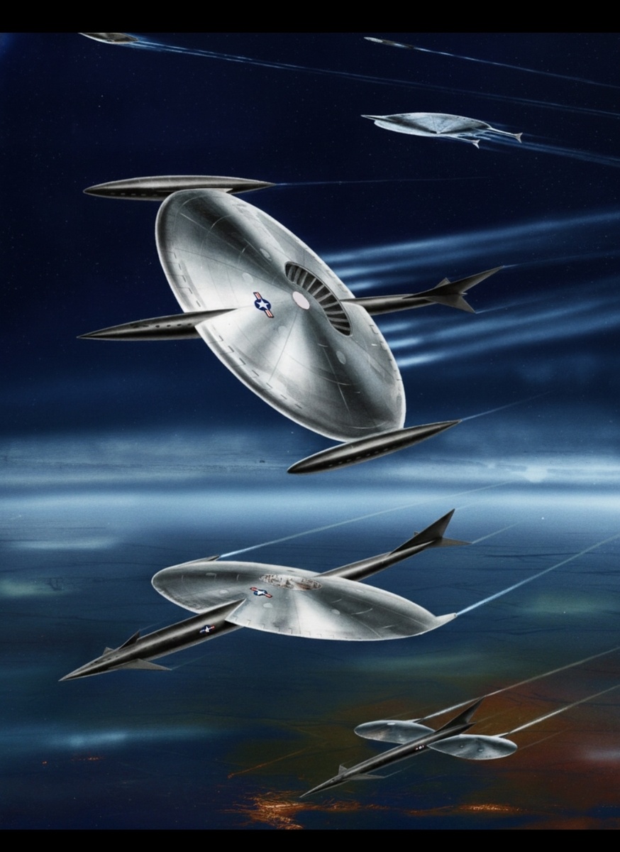 Это раскрашенная версия иллюстрации из американского журнала This Week за 1962 год. Иллюстрация была опубликована под заголовком "Будущие космические силы США" и показывала концепт сверхзвукового бомбардировщика ВВС США.