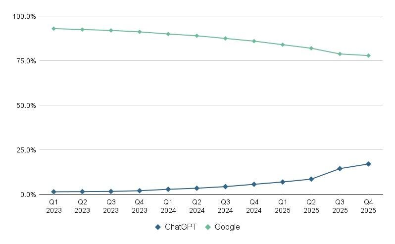 ). На первый взгляд выглядит впечатляюще: доля Гугла в “запросах к интернету” за 2 года опустилась до меньше 80%, а ChatGPT — выросла до 17%. Впрочем, на срезах по интентам все куда спокойней для Гугла: в транзакционных запросах доля 90%; ChatGPT оттянул (а, может, просто добавил в корзину) много информационных запросов и целый класс запросов “генеративно-креативных”. Понятно, что такой отчет — всегда прежде всего контент-маркетинг выпустившего его агентства. Но сам факт его появления под конец 2025 обещает сеошникам интересный и напряженный год в 2026:) Процесс трансформации пользовательских сценариев в интернете только еще начал разгоняться, но уже наблюдаем на приборах. https://firstpagesage.com/seo-blog/google-vs-chatgpt-market-share-report/