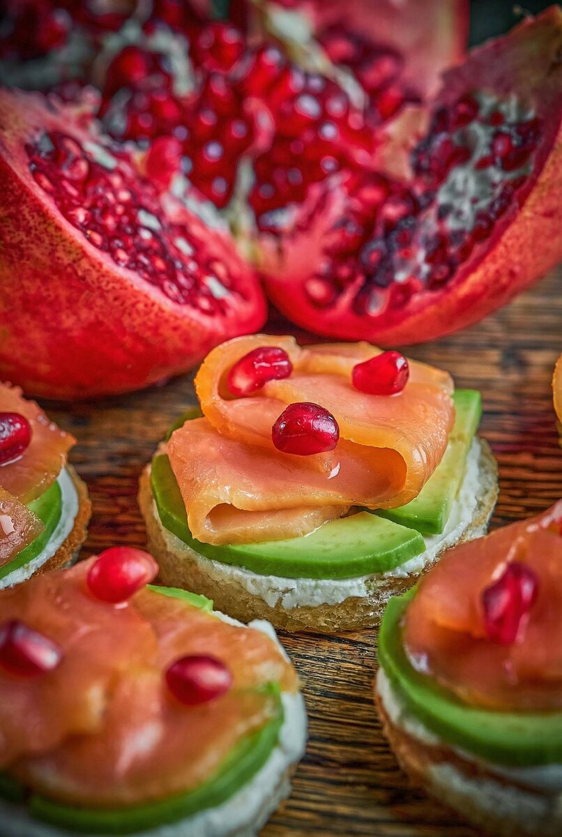 На столе: • брускетта с лососем и авокадо • канапе с хумусом и джонджоли • канапе с паштетом и гранатовой глазурью • канапе с дыней и козьим сыром • пеламуши Лёгкий формат, но с настоящим грузинским характером — щедрым, ярким и очень тёплым.