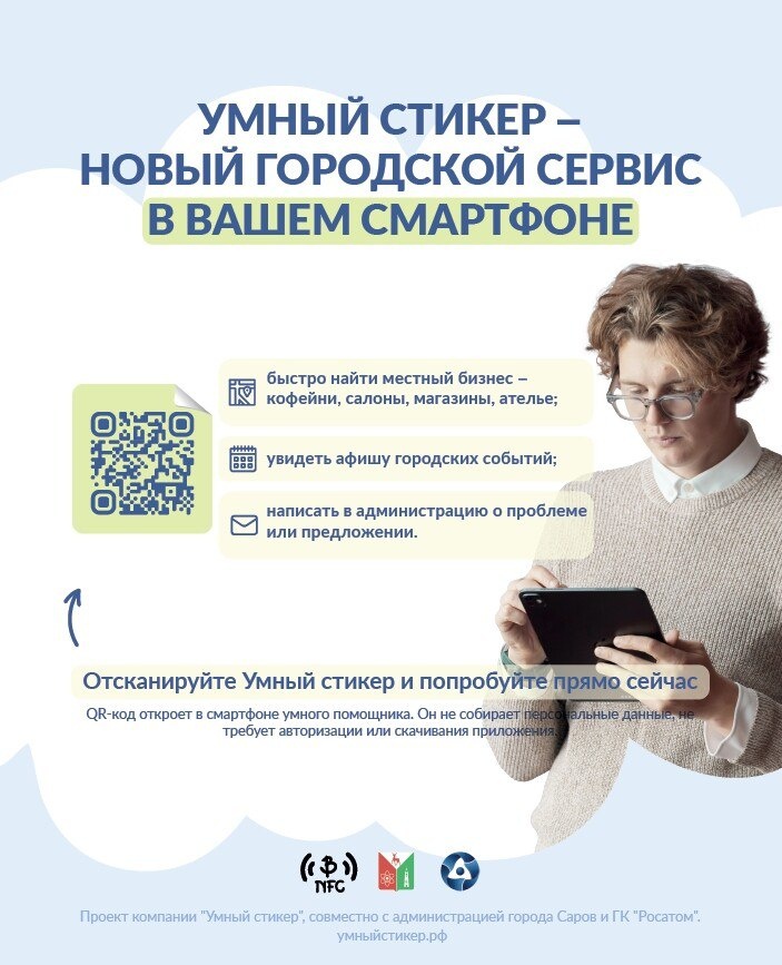 Хочешь узнать, куда в выходные сходить с ребенком, что сегодня идет в кино, как работает любимый ресторан и где рядом с домом находится ателье? Теперь вся информация о городских событиях, афиши мероприятий, контакты и адреса учреждений будут собраны в одном месте. И все благодаря тому, что Саров стал пилотной площадкой проекта «Умный стикер». Просто наводите камеру на QR-код и спросите у города всё, что нужно. Без приложений, без поиска по сайтам. QR-коды скоро появятся в МФЦ, у входа в муниципальные учреждения. А попробовать можно уже сейчас — QR-код перед вами. Или по ссылке: getinstant.link/sarov Сервис работает еще пока в тестовом режиме. Если есть идеи, что добавить в помощника — пишите на почту руководителю проекта, Даниилу Бредихину: db@bred-ideas.ru