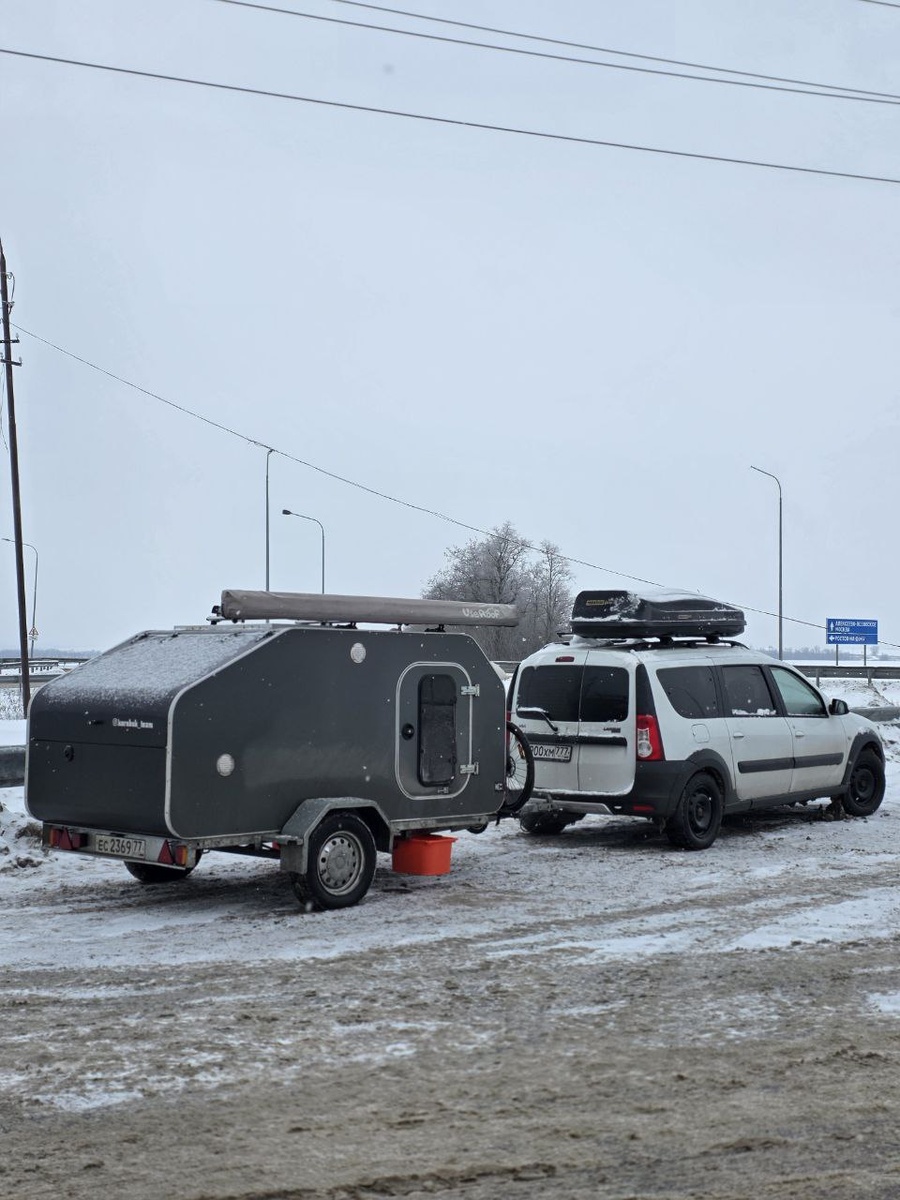 Ларгус на зимней резине с шипами, а Коробок — на летней. Переживал немного, не знал, как прицеп будет себя вести зимой. В целом, если ехать спокойно, то всё прогнозируемо. Кто-нибудь переобувает прицеп при зимней эксплуатации?