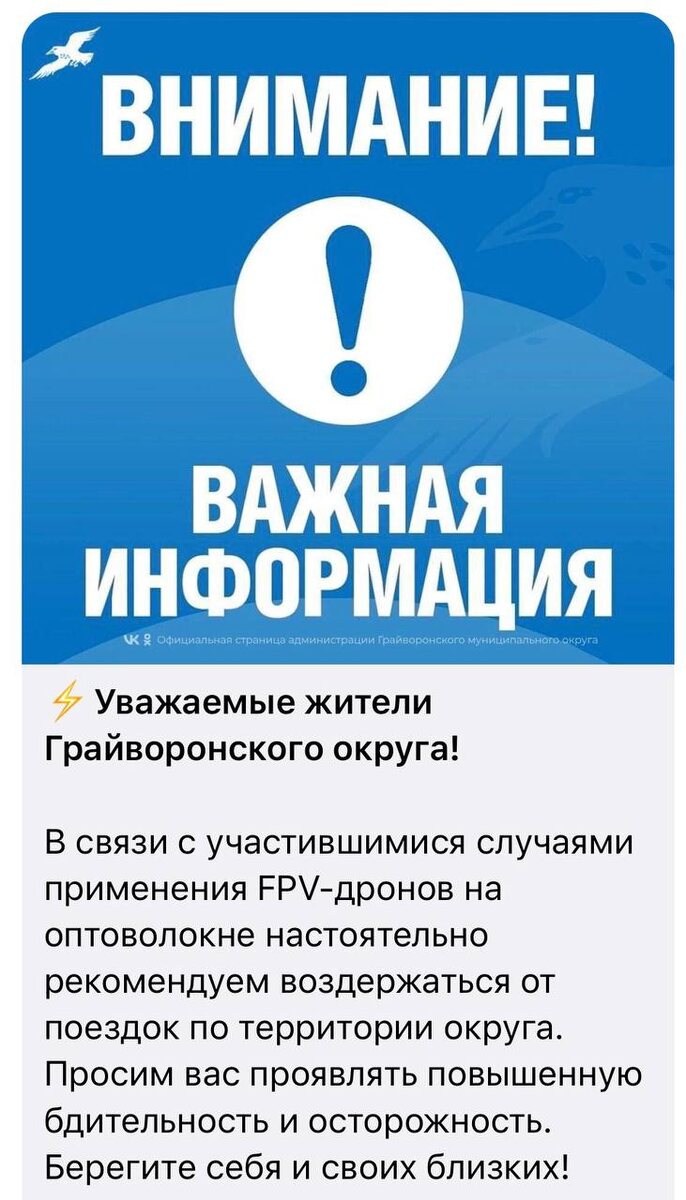 Жителей Грайворонского округа призвали воздержаться от поездок по территории муниципалитета из-за участившихся атак дронов на оптоволокне
