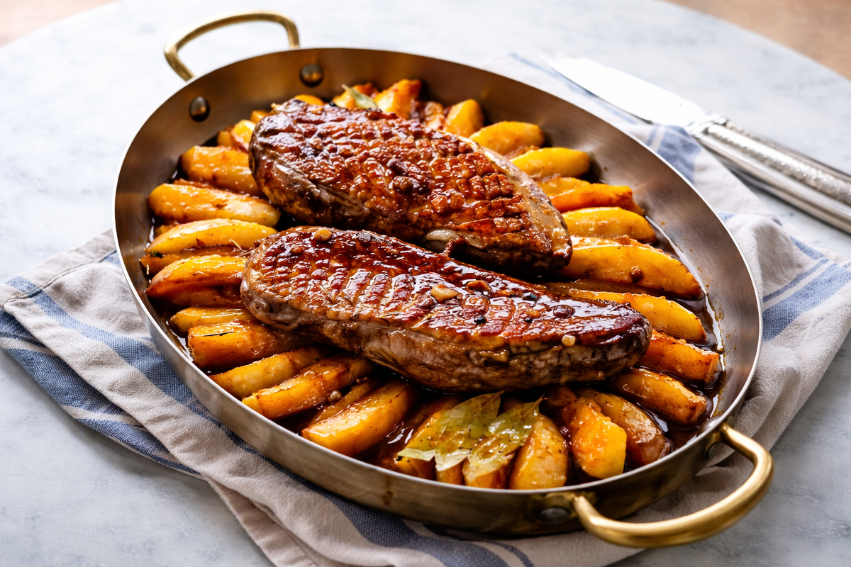 Это сочетание уже давно стало классикой высокой гастрономии: жирная, благородная утка, запечённые яблоки с концентрированной сладостью и кисло-сладкий соус — элементы, которые собираются в единое целое. В духе школы Ferrandi Paris здесь нет случайных шагов: кожа прожаривается медленно и последовательно, соус выстраивается на деглазировании, подача подчёркивает геометрию блюда и чистоту вкуса. Это блюдо для тех, кто готовит осознанно и ценит точность. Давайте приготовим его правильно.