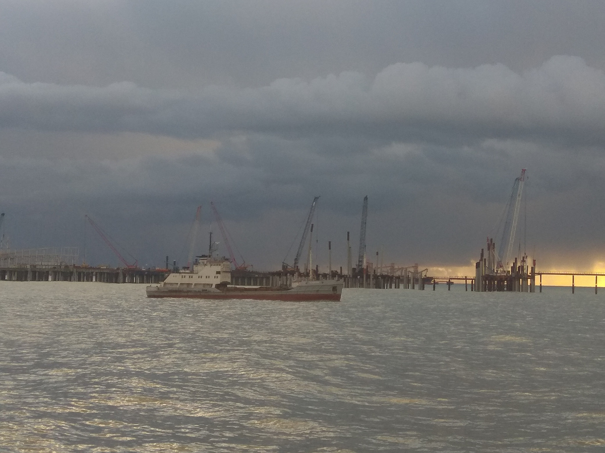 Это Черное море - Тамань. там причалов длиннющих, километровых, уходящих прямо в открытое море - видимо невидимо! Звук забиваемых свай постоянно. А мы дно углубляли - у причалов тех. Звук свай забиваемых в самую рань -