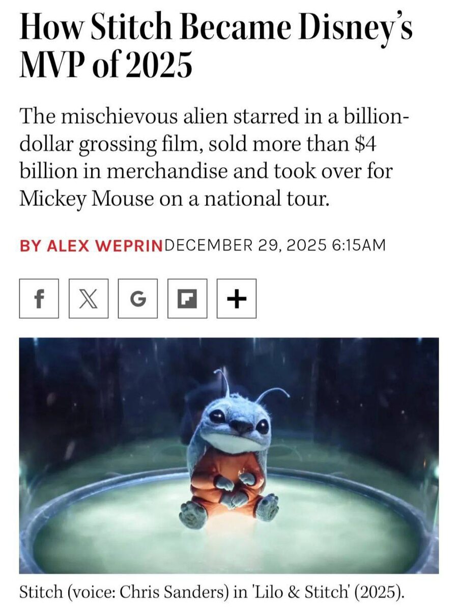 Disney сообщила о прибыли в 4 миллиарда долларов, полученной от продаж мерча с этим персонажем. Теперь компания планирует активно продвигать его образ, чтобы закрепить его в сознании миллениалов и зумеров. У Стича большие шансы на долговечность: ремейк «Лило и Стича» собрал более миллиарда долларов в прокате, и в результате Стич уже заменил Микки Мауса в туре Disney Holiday Magic Tour. Это популярное мероприятие, на котором медиагигант собирает пожертвования для нуждающихся и проводит ивенты для фанатов. NeuroFlux #Стич #Disney #МиккиМаус #мерч #прибыль #ремейк #ЛилоИСтич #продвижение #культура #фанаты