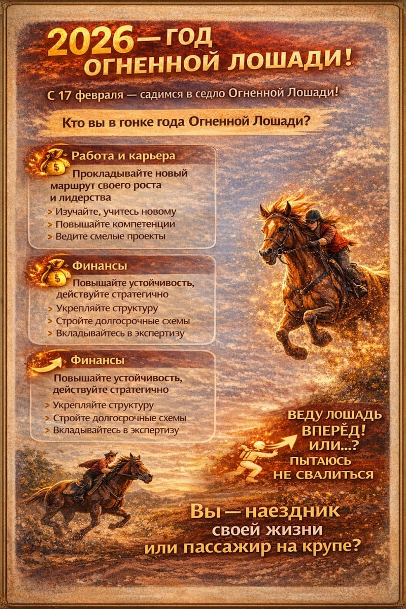 И вопрос не в том, что случится, а выдержит ли человек свой масштаб. 17 февраля мы садимся в седло Огненной Лошади. Темп растёт, решения всплывают быстрее, роли трескаются там, где давно жмут. Те, кто сидит в седле уверенно, ускоряются. Те, кто «держался на силе привычки», встречаются с развилками. Этот год особенно цепляет тех, у кого внутри давно зрела мысль: я стал(а) больше, чем моя текущая жизнь. Тезисы из статьи "План - прогноз на 2026 год по китайской системе Бацзы": 💡 назревшие решения поднимаются на поверхность 💡 деньги текут в сторону устойчивости капитала, перегрев их растрачивает 💡 в паре должны быть два устойчивых наездника, иначе кто-то падает 💡 темп - это инструмент, а не повод выжимать себя до нуля И ещё один вопрос, который задаёт 2026 год: Вы ведёте Лошадь к своим мечтам или болтаетесь в седле, стараясь удержаться на галопе? Я собрала большой прикладной разбор года: про самореализацию, деньги, отношения и ресурс в режиме высокой скорости. Ссылка на