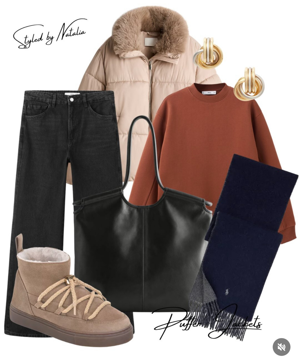 Мягкие зимние ботинки отвечают за комфорт, а лаконичная чёрная сумка добавляет аккуратной графичности. Шарф тёмно-синего оттенка завершает образ и даёт тот самый «праздничный штрих» без блёсток и пафоса.