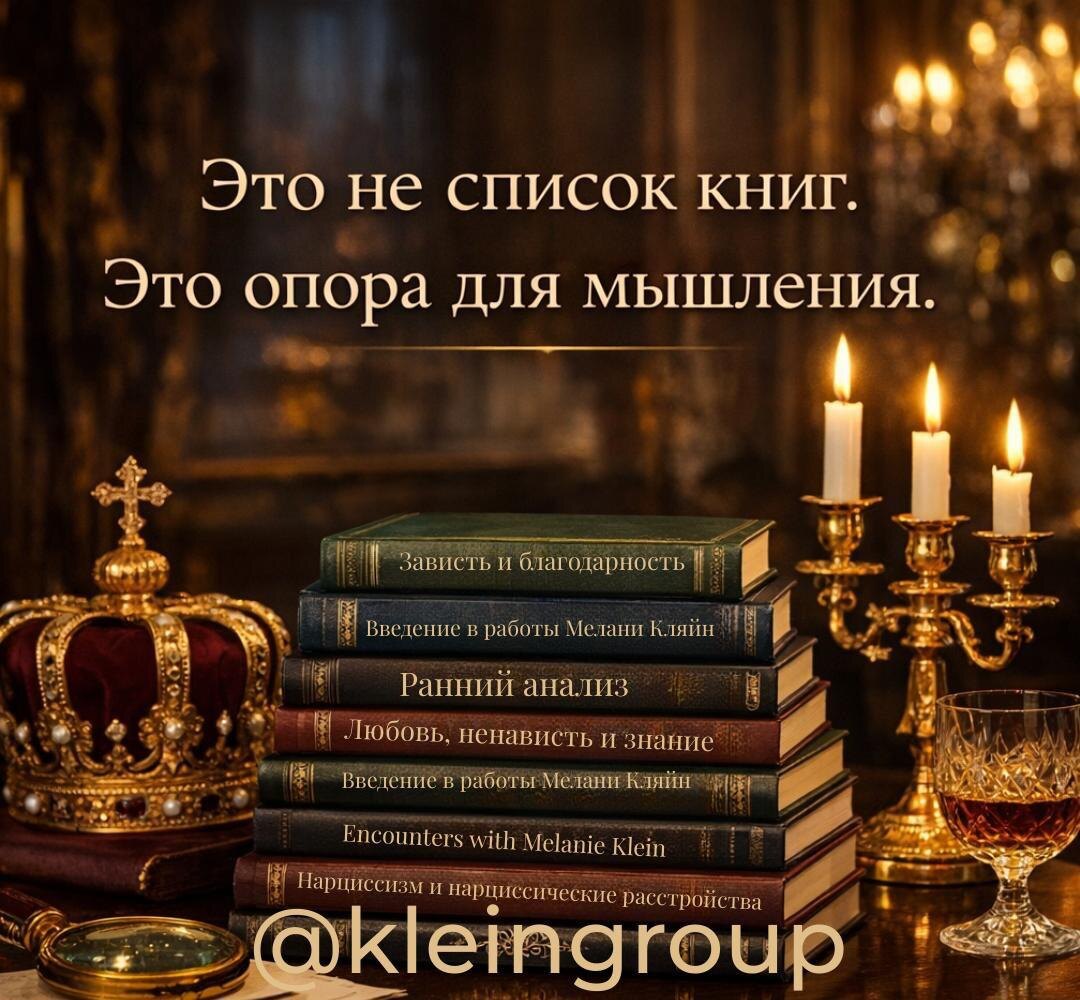И даже не учебный план. Это список из моего собственного опыта — тех текстов, к которым я бы возвращалась, если бы снова собирала кляйнианскую оптику для клиники. Честно скажу: я не уверена, что читать это «по порядку» — самый эффективный путь. Кляйнианская теория плохо усваивается линейно. Она начинает работать не тогда, когда всё прочитано, а тогда, когда текст встречается с клиническим материалом. Но если нужен минимум, чтобы вообще понимать, о чём мы здесь разговариваем — если хочется отличать структуру от культурных интерпретаций, клинику от красивых слов, работу с завистью от разговоров о «травмах», — то это те книги, в которые я бы советовала. 📘 Мелани Кляйн — основание метода 1. «Зависть и благодарность» — Мелани Кляйн Ключевой текст о примитивной зависти, разрушительности и возможности интеграции. Без этой книги невозможно понять, почему анализ «не идёт», даже если формально всё делается правильно. 2. «Развитие одного ребёнка» — Мелани Кляйн Подробное клиническое наблюдени