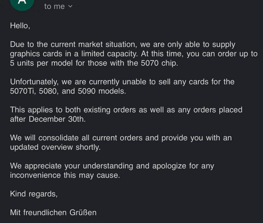 Поставки карт от Nvidia в Европе сильно ограничили. Поставщики из Германии отменили все заказы на RTX 5090, RTX 5080 и RTX 5070 Ti из-за окончания запасов техники. В качестве альтернативы предлагают завезти RTX 5070, но не более пяти видеокарт на магазин. Причина дефицита в классической ИИ-гонке, Nvidia направляет мощности на дата-центры, а мировой дефицит памяти усугубляет ситуацию. Спрос превышает предложение, поэтому видеокарт для домашних ПК почти не осталось. Сборщикам соболезнуем ПОДПИСАТЬСЯ НА КАНАЛ.