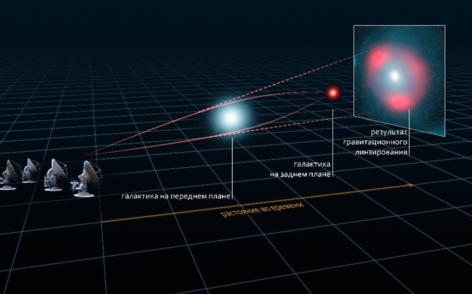 То, что гравитационное линзирование существует, доказано, и часто наблюдается при исследовании далекого космоса. Нахождение на одной линии наблюдения двух массивных галактик оказывается не такой редкий случай. Современное оборудование позволяет находить данный эффект при наблюдении галактик. Как это работает хорошо показано на рисунке ниже.