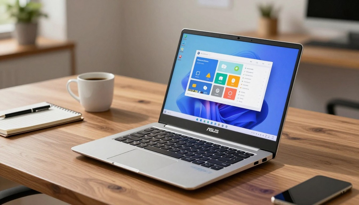 - A sleek ASUS Vivobook 15.6 laptop positioned prominently in the foreground on a modern wooden desk. The device is open, displaying an inviting home screen with vibrant colors, reflecting its impressive display quality. The middle ground features a blurred background of a well-lit contemporary office space with tasteful decor and potted plants, creating an inviting atmosphere. A natural light source from a nearby window casts soft shadows, enhancing the laptop's metallic finish. The laptop is shown from a slight angle, emphasizing its thin profile and modern design. The overall mood is professional and sophisticated, perfect for a tech review setting. No people or text elements are included, focusing solely on the laptop and its environment.