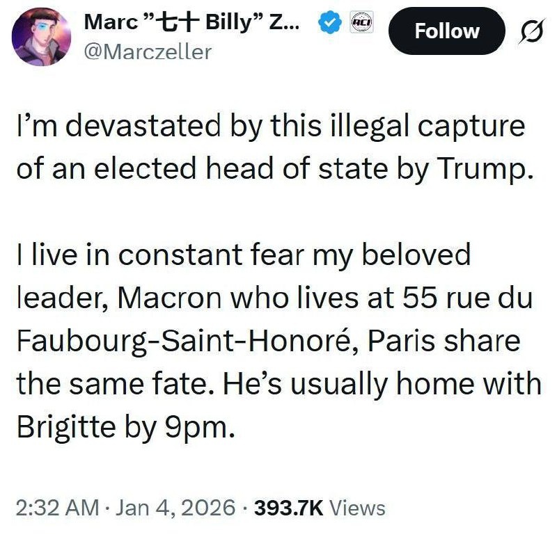 !» После похищения Мадуро французы начали массово просить Трампа «освободить» и их президента Макрона, в панических постах указывая его домашний адрес и расписание. Посыл, похоже, такой: «Дорогой Дональд, раз уж ты начал коллекцию, держи и нашего! Рейтингом не блещет, но для твоей коллекции лидеров сойдёт». 🚲 Подпишись на Телега Online