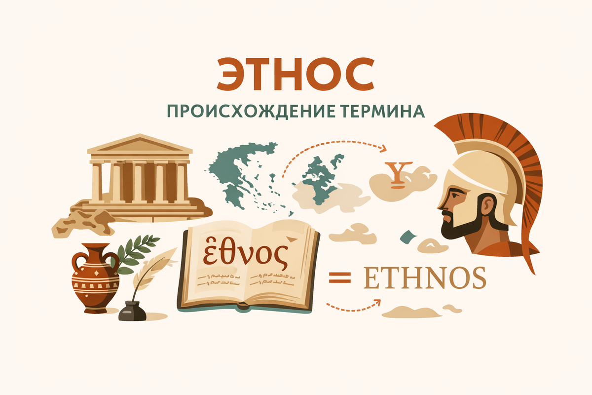 В этой статье разберём, когда и кем впервые употреблялся термин «этнос». Особое внимание уделим Древней Греции, где это понятие зародилось и приобрело своё первоначальное значение в историческом и культурном контексте. По современному определению, приведённому в Википедии, можно увидеть следующее: Э́тнос (греч. ἔθνος — народ) — группа людей, имеющая общее название и элементы культуры, обладающая мифом (версией) об общем происхождении и общей исторической памятью, ассоциирующая себя с особой территорией и обладающая чувством солидарности. Это определение даёт удобную отправную точку для исследования истории термина. Во-первых, оно указывает на его древнегреческие корни, во-вторых — открывает возможность проследить, как менялось значение слова ἔθνος на протяжении истории. Анализируя древнегреческое происхождение термина, можно обратиться к древнегреческо-русскому словарю Иосифа Ханановича Дворецкого. Под словом «ἔθνος» встречаются несколько значений: общество, группа, толпа, племя. Несмо