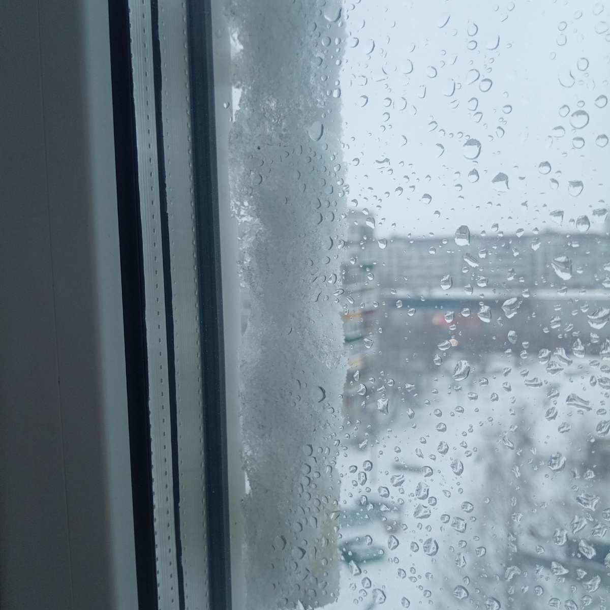 Проснулась около восьми, почти сразу зазвенел будильник. В доме тихо и на улице тишина. Значит закончился этот снегопад со штормовым ветром. Встала, подошла к окну посмотреть на обстановку, на градусник. Обстановка спокойная, ветра нет, снега нет, уже хорошо. Градусника не увидела, точнее, увидела вот это. Снег его залепил)). Поняла по мокрому стеклу, что на улице тепло.
