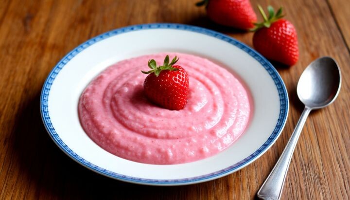 Красивое и полезное блюдо из любимого мультфильма Хотите порадовать ребенка знакомым вкусом детства? Вспомним «Я вкусней накашеварю» из популярного мультсериала «Маша и Медведь» (0+). А теперь приготовим ту самую аппетитную розовую кашу, которую так полюбил весь детский мир. Нам потребуется: 1. Налейте молоко в кастрюлю и поставьте на средний огонь. Добавьте щепотку соли и сахар по вкусу. 2. Когда молоко начнет закипать, добавьте манку тонкой струйкой и перемешивайте до загустения массы. 3. Пока варится каша, размороженные ягоды клубники измельчите блендером или вилкой до состояния пюре. Рекомендуем протереть через сито от семечек. 4. После того как каша стала густой, снимите кастрюлю с огня и вмешайте ягодное пюре. Хорошо перемешайте смесь, пока она равномерно не приобретет нежно-розовый оттенок. 5. Подавайте горячую ароматную кашу ребенку с ложечкой сливочного масла или украсьте клубничкой. Теперь вы знаете простой и вкусный рецепт знаменитой розовой каши из мультфильма «Маша и Медве