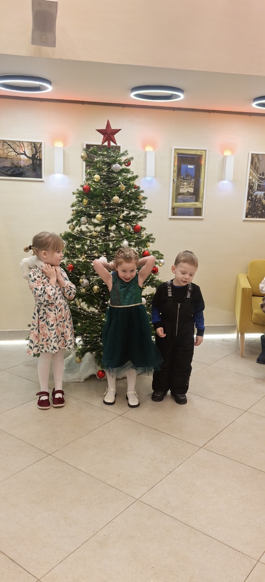 При входе нас встретили две дамы , приветливые , спокойные , все объяснили и на этом мы продвинулись в гардероб. Там тоже все прошло спокойно. И далее нас встретил большой холл. С новогодней елкой . Детям разрешили побегать и пошуметь. Мы фотографировались , знакомились, общались и ждали принлашения в зал.