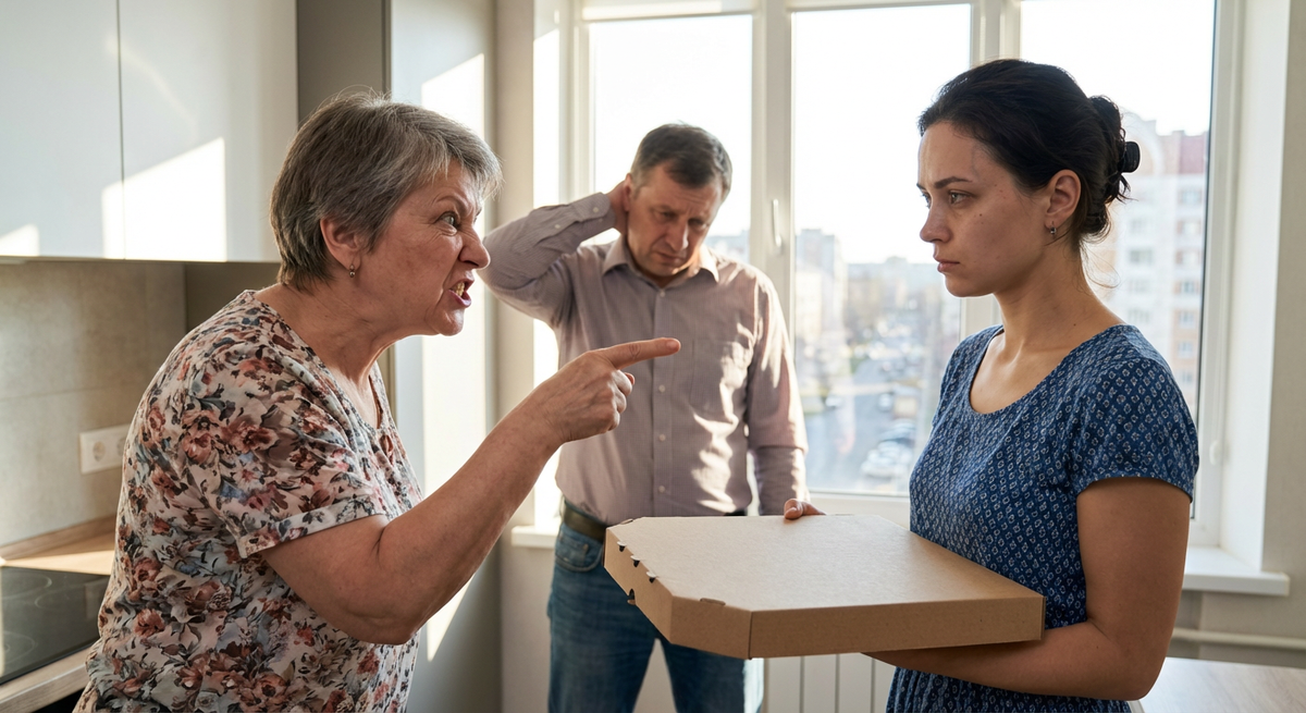 – Я вижу, что это пицца, я не слепая, – процедила свекровь, не двигаясь с места. – Я спрашиваю, где нормальная еда? Мы ехали через весь город. Отец голодный. Света с детьми. Ты чем детей кормить собралась? Этим?
